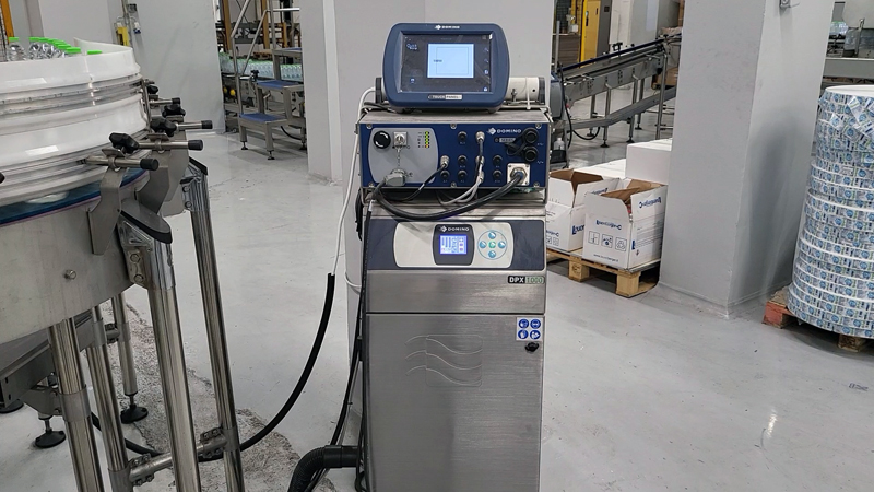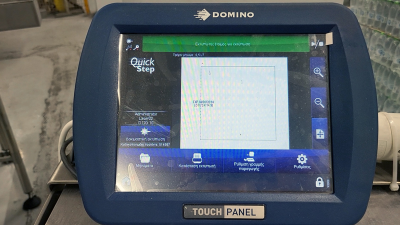 Responding to this need we installed two industrial Domino laser technology printers for the coding of the primary packaging (PET botthles), as well as an inkjet technology industrial printer for the coding of the secondary packaging (shrink wrapped bottles).